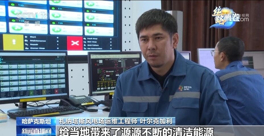 總臺記者 張譽耀:這里就是札納塔斯,哈薩克斯坦最大的風(fēng)力發(fā)電場之一,像我身后這樣一座風(fēng)能發(fā)電機能滿足當(dāng)?shù)丶s4000戶家庭的用電需求,而我身后一共有40座這樣的風(fēng)能發(fā)電機,也就是說能夠滿足當(dāng)?shù)?6萬戶家庭的用電需求。正是這一座座轉(zhuǎn)動的風(fēng)能發(fā)電機,點亮了札納塔斯這座小城的日常生活。