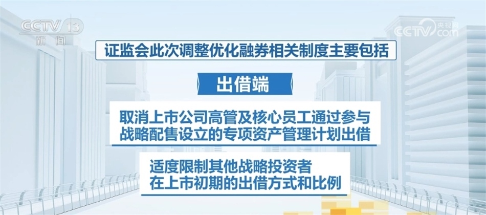 證監(jiān)會此次調(diào)整優(yōu)化融券相關制度主要包括:融券端,將融券保證金比例由不得低于50%上調(diào)至80%,對私募證券投資基金參與融券的保證金比例上調(diào)至100%;出借端,取消上市公司高管及核心員工通過參與戰(zhàn)略配售設立的專項資產(chǎn)管理計劃出借,適度限制其他戰(zhàn)略投資者在上市初期的出借方式和比例。