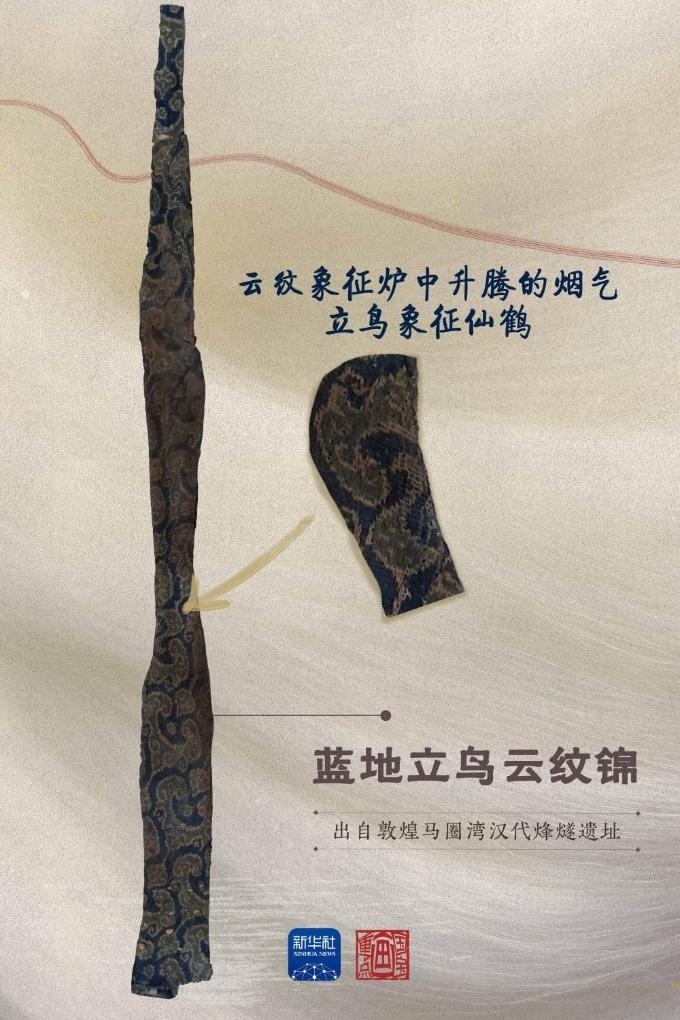 這件織錦殘件采用漢代典型的絲織技藝——平紋經(jīng)錦,此錦以深藍(lán)為地,顯黃、綠二色花,織出云氣紋。專家推測該織錦曾為裝飾用物。