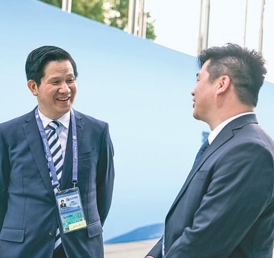 10月17日,參加“一帶一路”企業(yè)家大會的代表在交談。本報記者 蔣雨師攝