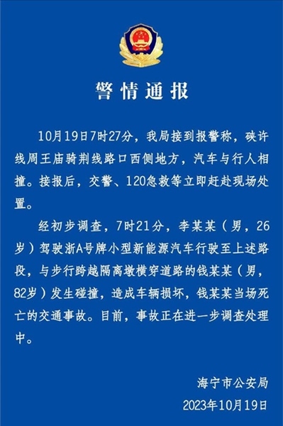 ·浙江海寧82歲老人橫穿馬路被撞身亡,警方通報:事故正在進(jìn)一步調(diào)查處理。