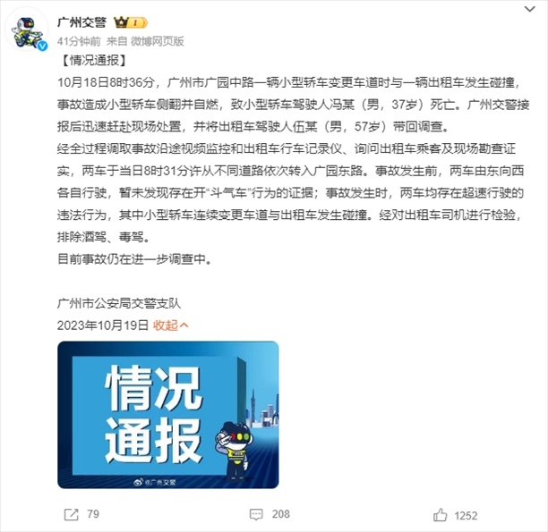 ·廣州交警通報寶馬車與出租車發(fā)生碰撞后撞上橋墩起火、駕駛?cè)怂劳鍪录簝绍嚲?、未發(fā)現(xiàn)開“斗氣車”。出租車所屬公司發(fā)聲:司機(jī)已盡力剎車,但確實存在超速。
