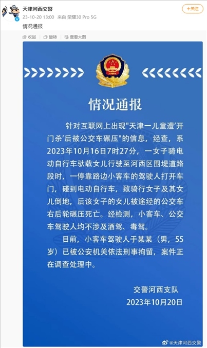 ·天津警方通報“兒童遭開門殺后被公交碾壓死亡”:小客車駕駛?cè)艘驯恍淌戮辛?,案件正在調(diào)查處理中。