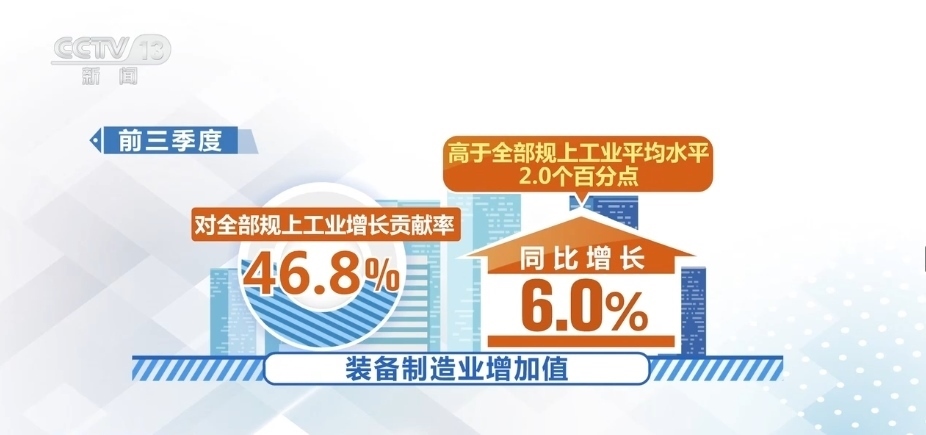 前三季度,在工業(yè)41個(gè)大類(lèi)行業(yè)中,27個(gè)行業(yè)增加值實(shí)現(xiàn)增長(zhǎng),增長(zhǎng)面達(dá)65.9%。其中,裝備制造業(yè)增加值同比增長(zhǎng)6.0%,高于全部規(guī)上工業(yè)平均水平2.0個(gè)百分點(diǎn),對(duì)全部規(guī)上工業(yè)增長(zhǎng)貢獻(xiàn)率達(dá)46.8%。