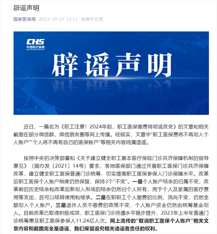·“職工醫(yī)保費(fèi)將不再劃入個(gè)人賬戶(hù)”“個(gè)人將不再有自己的醫(yī)保賬戶(hù)”?國(guó)家醫(yī)保局:純屬造謠。