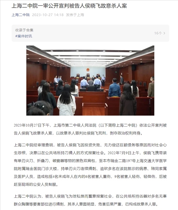 ·瑞金醫(yī)院門(mén)診大樓故意殺人案一審宣判:死刑,剝奪政治權(quán)利終身。