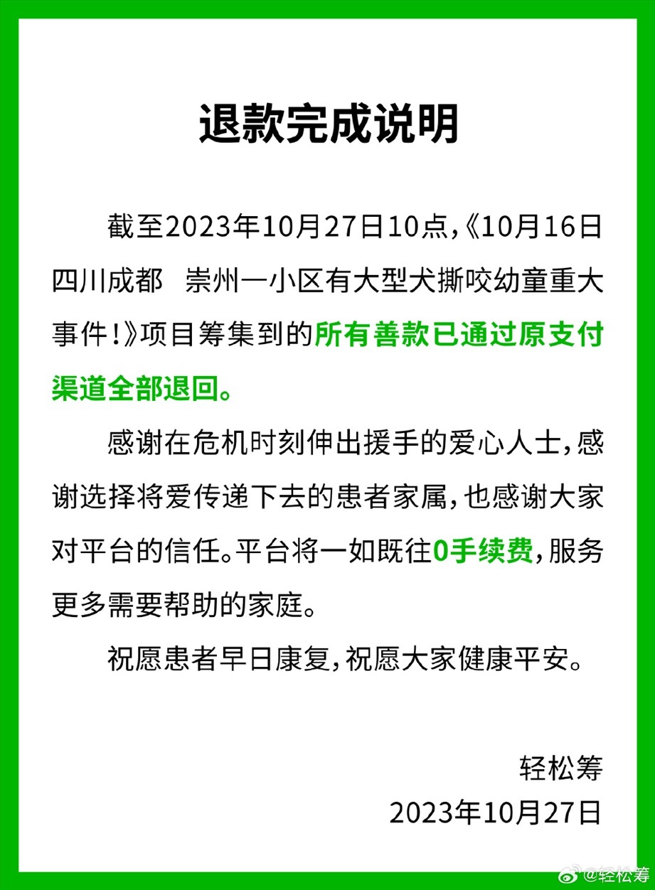 ·輕松籌平臺(tái)稱(chēng)為被狗咬女童籌集的所有善款已全部退回。
