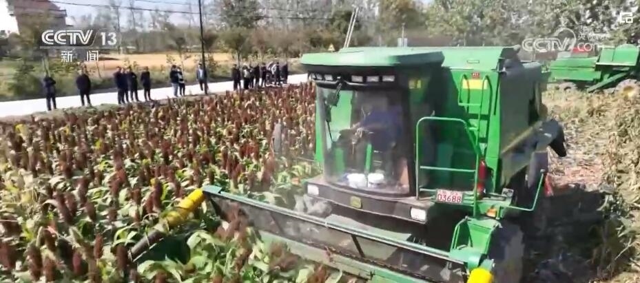 在江蘇灌南,萬畝高粱開鐮收割。一臺臺大型收割機(jī)將粒粒高粱收入囊中。