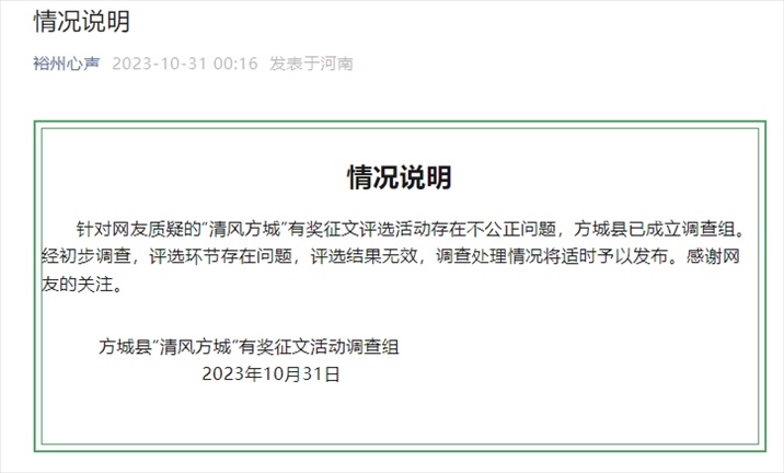 ·獲獎?wù)魑?2篇為同一作者,官方通報(bào)調(diào)查結(jié)果:評選環(huán)節(jié)存在問題,評選結(jié)果無效。