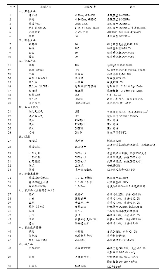 流通領(lǐng)域重要生產(chǎn)資料市場(chǎng)價(jià)格監(jiān)測(cè)內(nèi)容包括9大類50種產(chǎn)品的價(jià)格。類別與產(chǎn)品規(guī)格說明詳見附表。