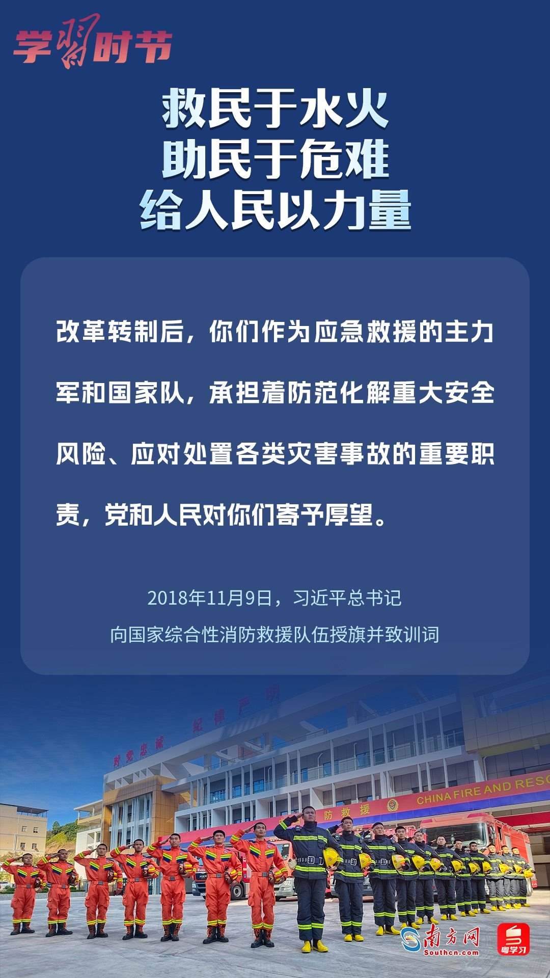 2018年11月9日,習(xí)近平總書記向國家綜合性消防救援隊(duì)伍授旗并致訓(xùn)詞,標(biāo)志著這支全新的人民隊(duì)伍舉旗定向、踏上征程。五年來,在總書記重要訓(xùn)詞精神的指引下,國家綜合性消防救援隊(duì)伍主動融入應(yīng)急管理工作大局,積極創(chuàng)新社會消防安全治理,全力防風(fēng)險(xiǎn)保安全護(hù)穩(wěn)定,經(jīng)受了一個(gè)又一個(gè)考驗(yàn),打贏了一場又一場硬仗,消防工作和消防救援隊(duì)伍建設(shè)發(fā)生了全方位、深層次變革。