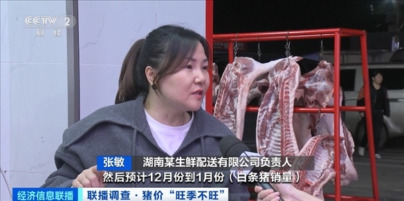 湖南某生鮮配送有限公司負責(zé)人 張敏:10月份到11月份(每天銷量)是450頭到600頭。預(yù)計12月份到1月份(白條豬銷量)會增長到一天800頭到1000頭。