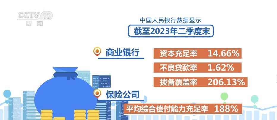 中國人民銀行數(shù)據(jù)顯示,截至2023年二季度末,商業(yè)銀行資本充足率、不良貸款率和撥備覆蓋率分別為14.66%、1.62%和206.13%,保險公司平均綜合償付能力充足率188%,證券公司風(fēng)險覆蓋率、平均資本杠桿率分別為255.38%、18.78%,信用風(fēng)險處于可控水平,損失抵御能力總體較為充足。