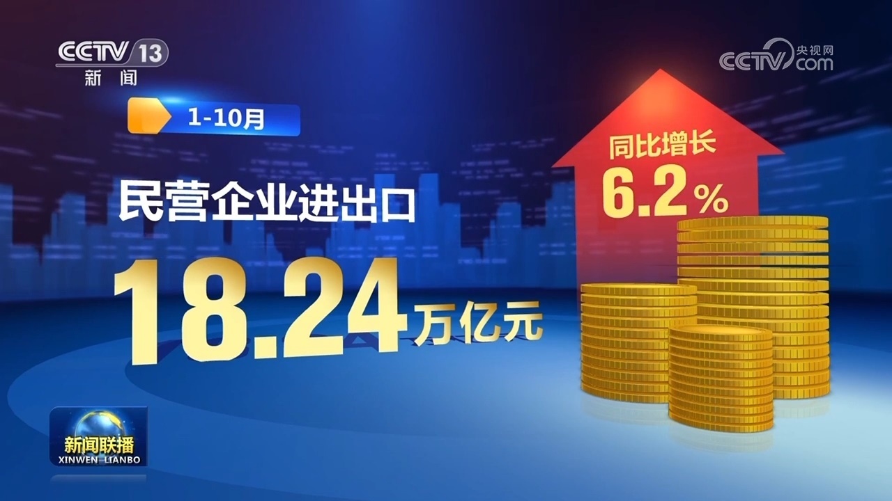 新動能帶動作用持續(xù)釋放,推動外貿(mào)領(lǐng)域積極因素累積增多。前三季度跨境電商進出口額達1.7萬億元,同比增長14.4%,保持較快增長。貿(mào)易結(jié)構(gòu)優(yōu)化升級,1—10月,我國一般貿(mào)易進出口增長1.8%,占我國外貿(mào)總值的64.9%,比去年同期提升1.1個百分點。民營企業(yè)進出口18.24萬億元,同比增長6.2%,成為穩(wěn)外貿(mào)主力軍。
