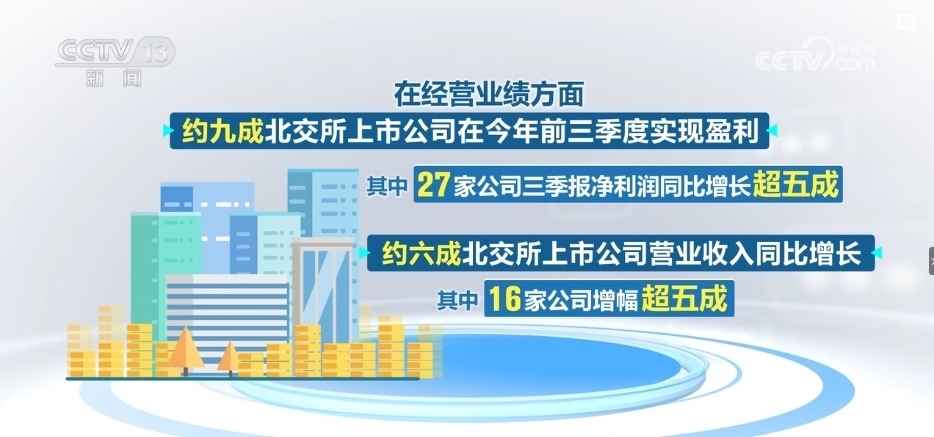 在經(jīng)營(yíng)業(yè)績(jī)方面,約九成北交所上市公司在2023年前三季度實(shí)現(xiàn)盈利。其中,27家公司三季報(bào)凈利潤(rùn)同比增長(zhǎng)超五成。約六成北交所上市公司營(yíng)業(yè)收入同比增長(zhǎng),其中,16家公司增幅超五成。