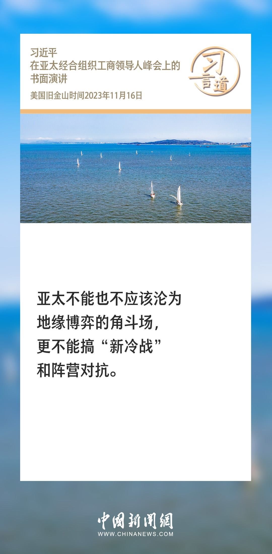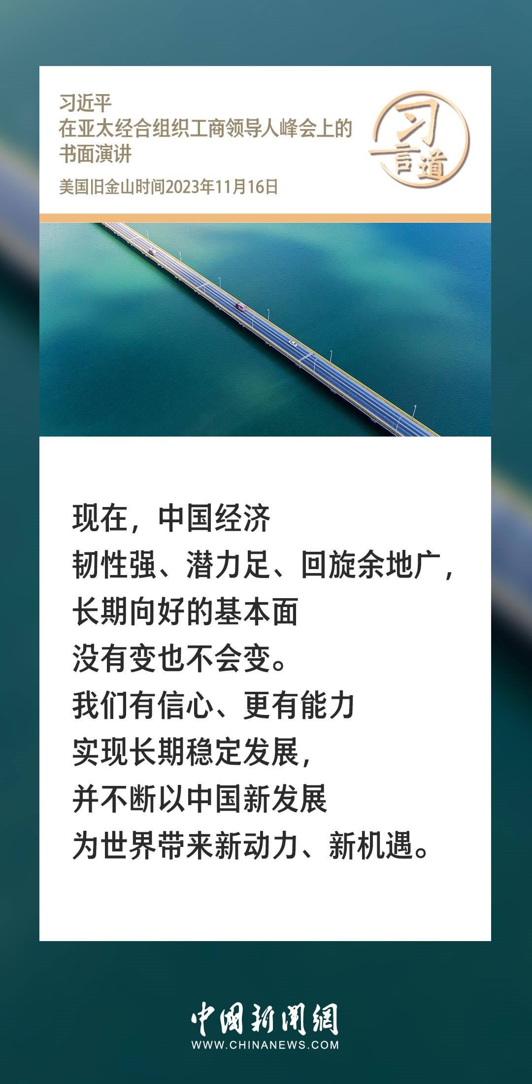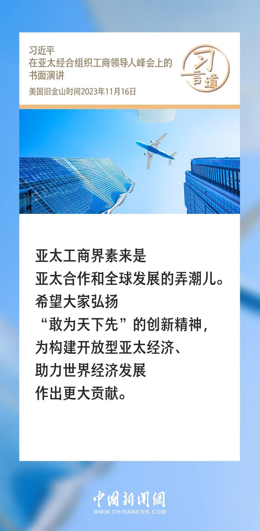 當?shù)貢r間11月16日上午,國家主席習近平向在舊金山舉行的亞太經(jīng)合組織工商領導人峰會發(fā)表題為《同心協(xié)力 共迎挑戰(zhàn) 譜寫亞太合作新篇章》的書面演講。習近平指出——