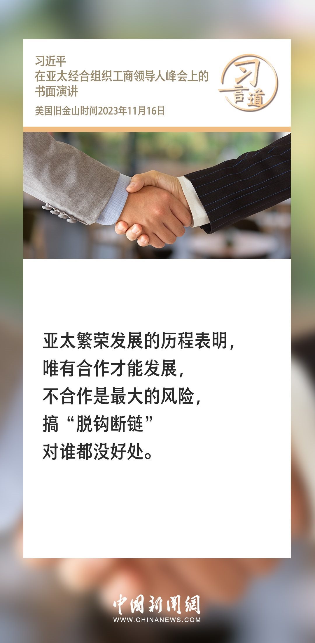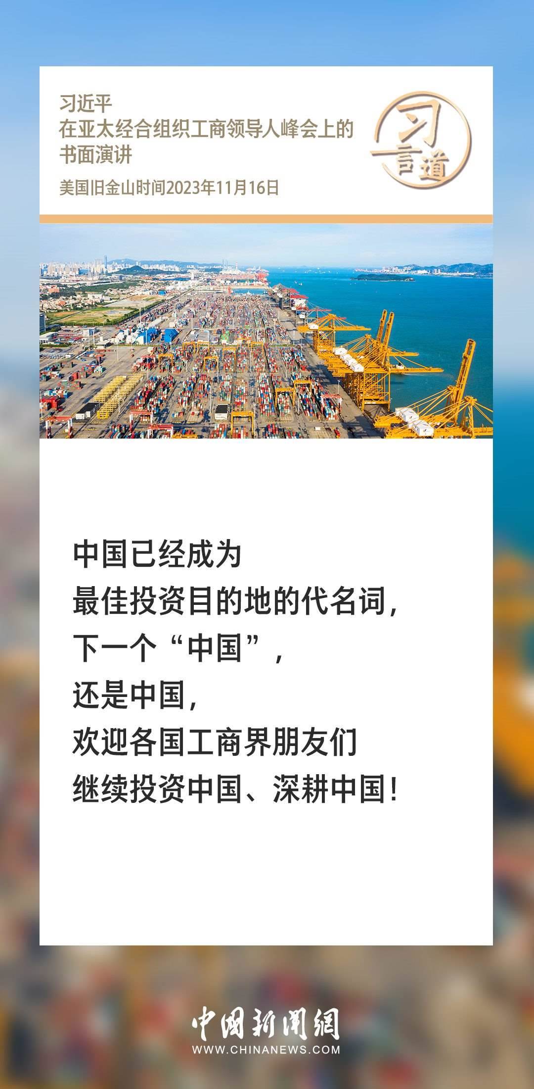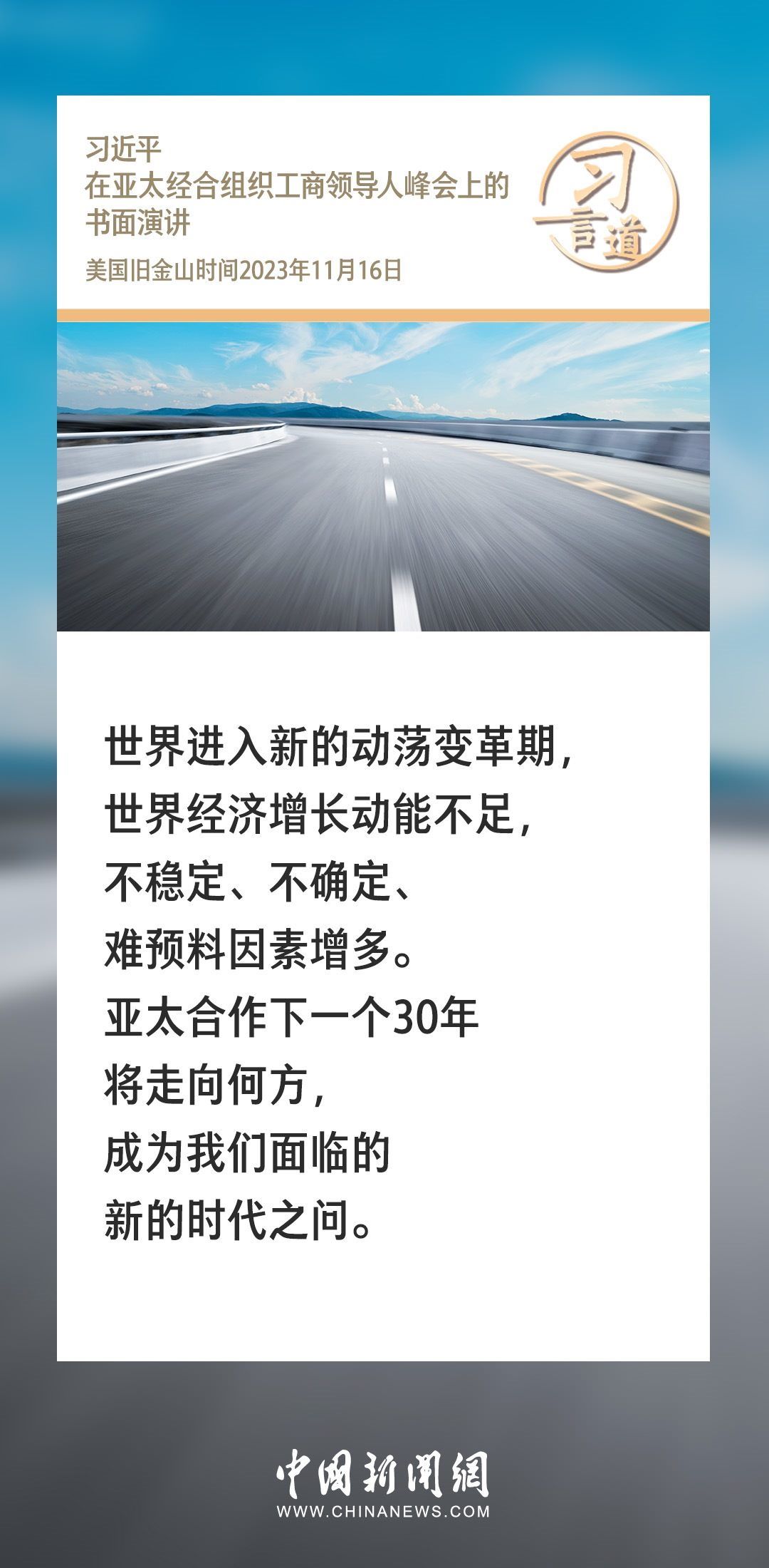 當?shù)貢r間11月16日上午,國家主席習近平向在舊金山舉行的亞太經(jīng)合組織工商領導人峰會發(fā)表題為《同心協(xié)力 共迎挑戰(zhàn) 譜寫亞太合作新篇章》的書面演講。習近平指出——