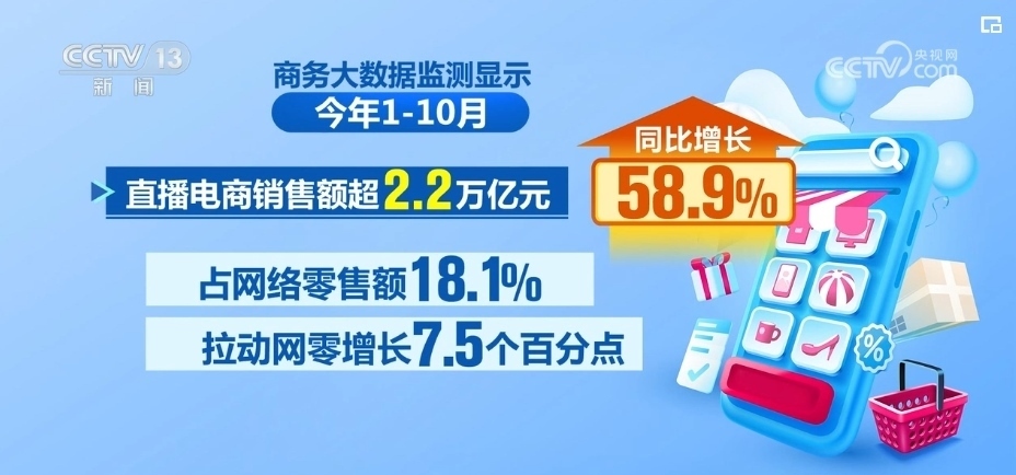 商務(wù)大數(shù)據(jù)監(jiān)測顯示,2023年1—10月份,直播電商銷售額超2.2萬億元,同比增長58.9%,占網(wǎng)絡(luò)零售額18.1%,拉動(dòng)網(wǎng)零增長7.5個(gè)百分點(diǎn)。其中,中秋、國慶期間,住宿、旅游、文娛和餐飲日均在線銷售額同比分別增長133.7%、123.1%、82.1%和19.7%。