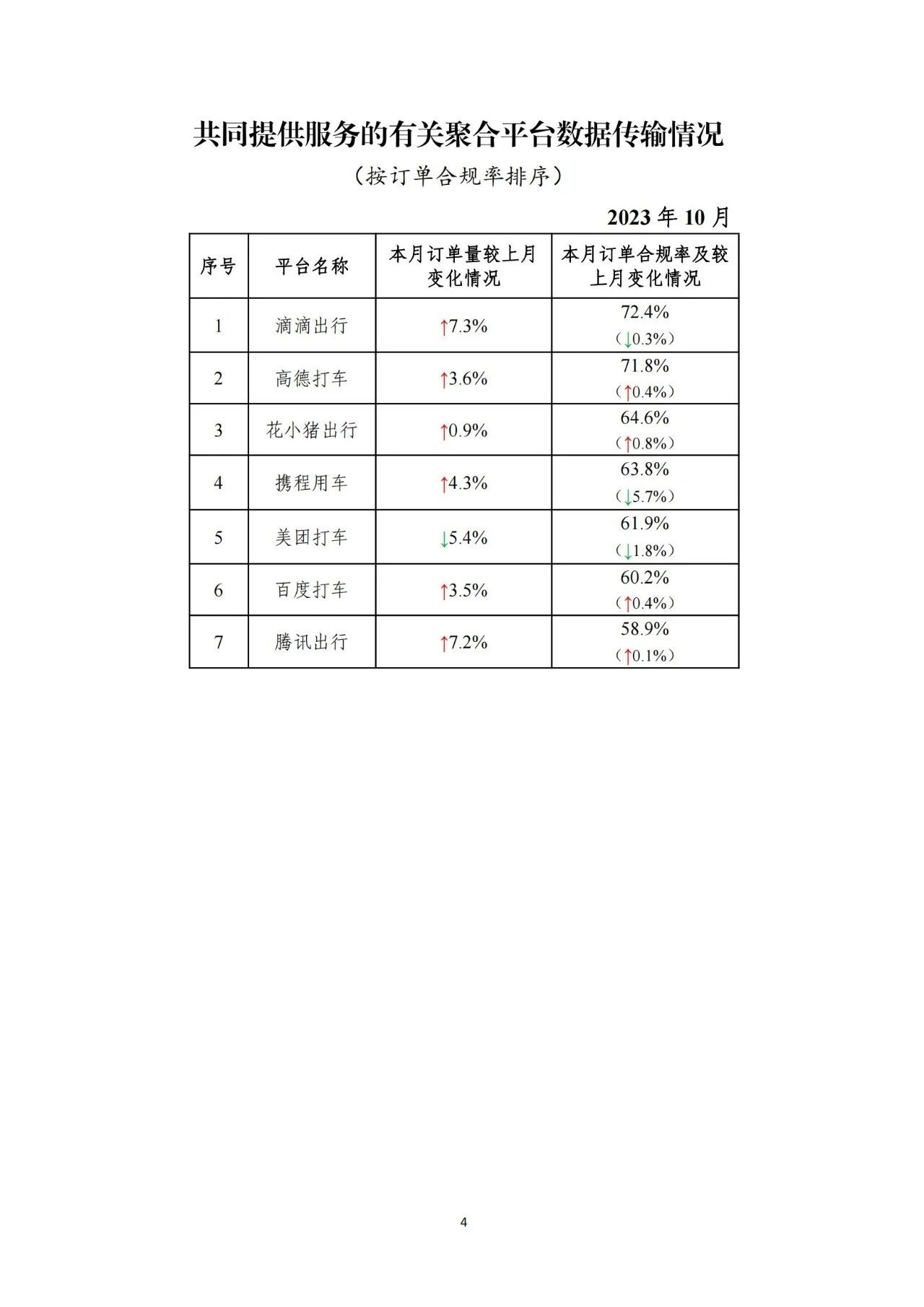 其中,面向乘客、與網(wǎng)約車平臺公司共同提供服務(wù)的平臺(俗稱“聚合平臺”)完成2.23億單,環(huán)比上升3.6%。按訂單合規(guī)率由高到低的分別是滴滴出行、高德打車、花小豬出行、攜程用車、美團(tuán)打車、百度打車、騰訊出行。