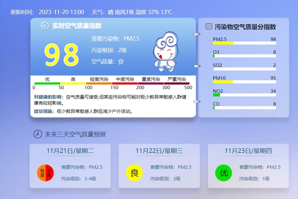央視網(wǎng)消息:據(jù)@北京環(huán)境監(jiān)測 消息,11月20日13時(shí)的實(shí)時(shí)空氣質(zhì)量指數(shù),北京目前的污染級別達(dá)到2級,東城、西城、朝陽、豐臺(tái)、通州、房山、大興等區(qū)已顯示為輕度污染。