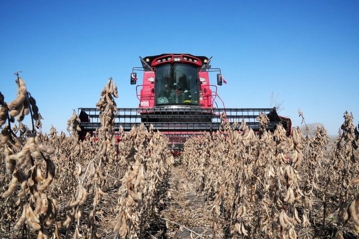 收割機(jī)在黑龍江省富錦市一大豆地塊收獲大豆(2023年10月11日攝)。新華社記者 王建威 攝