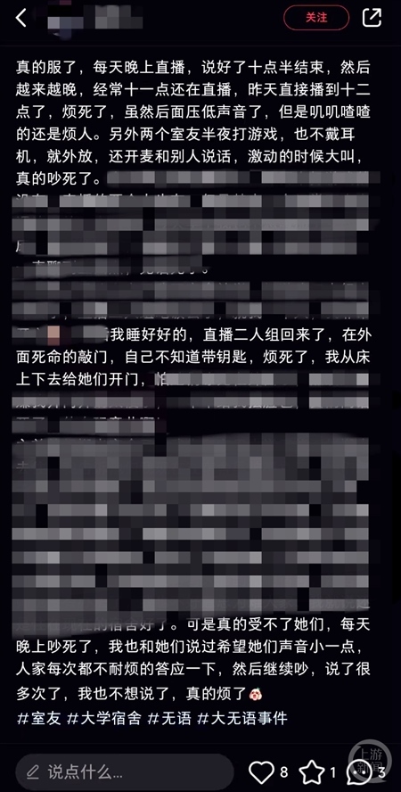 在某社交平臺(tái)搜索“室友在宿舍直播”,上游新聞?dòng)浾甙l(fā)現(xiàn)超過(guò)50篇筆記都是有關(guān)大學(xué)生寢室直播引發(fā)室友不滿(mǎn):“每天晚上吵死了,我也和她們說(shuō)過(guò)希望她們聲音小一點(diǎn),人家每次都不耐煩地答應(yīng)一下,然后繼續(xù)吵”“我覺(jué)得在寢室直播就是不合適啊,但是想不到什么嚴(yán)肅有效的理由讓她不直播,求大家?guī)兔Τ鲋\劃策一下”……