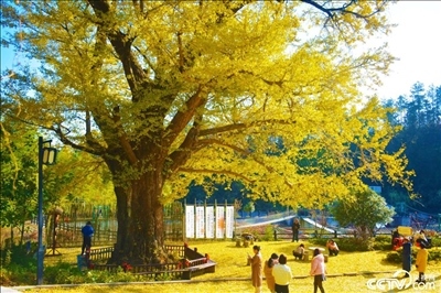 2023年11月25日,安徽安慶,響腸鎮(zhèn)請(qǐng)水寨村千年銀杏樹披“金甲”,進(jìn)入最佳觀賞期,吸引游客前來(lái)游玩賞景。