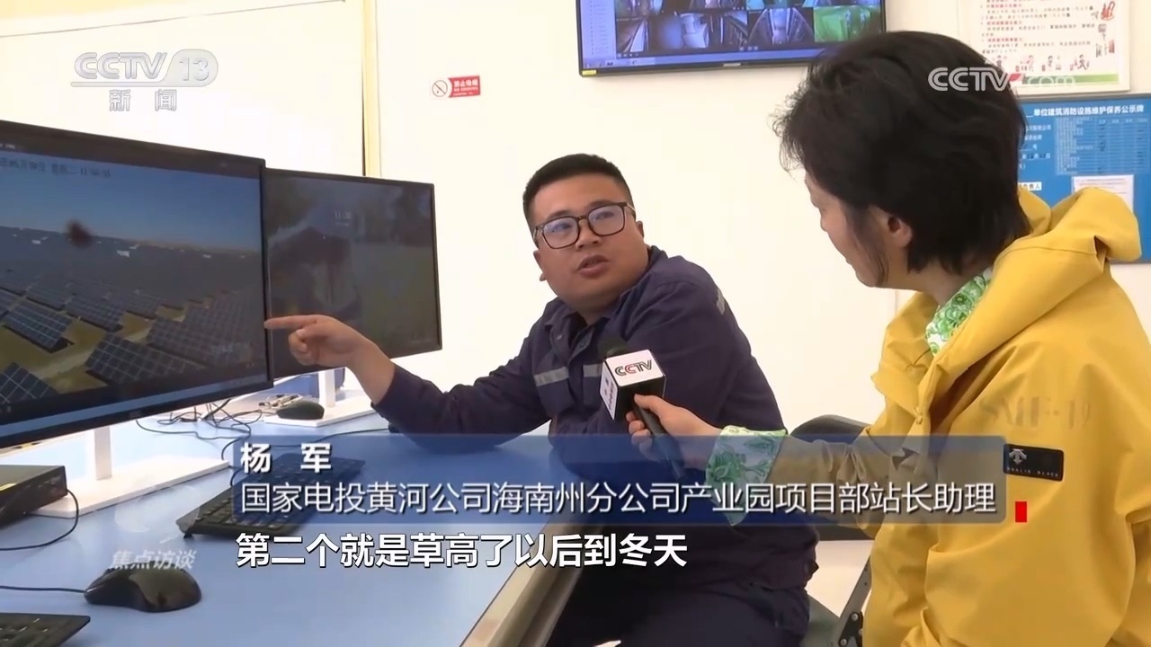 國(guó)家電投黃河公司海南州分公司產(chǎn)業(yè)園項(xiàng)目部站長(zhǎng)助理?xiàng)钴姡骸肮夥逑旅孢@些羊,就是我們請(qǐng)過來幫忙除草的。因?yàn)槊磕暌坏较奶?,園區(qū)電池組件下面草就特別高,長(zhǎng)高了以后會(huì)遮擋電池組件,一個(gè)是影響發(fā)電效率,再一個(gè)秋冬季有火災(zāi)隱患?!?/p>