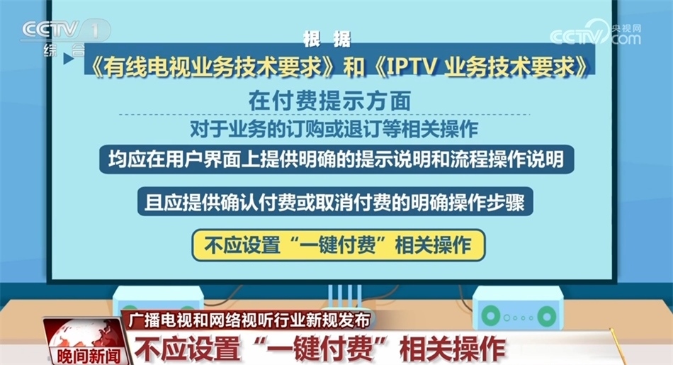 在付費(fèi)提示方面,對(duì)于業(yè)務(wù)的訂購(gòu)或退訂等相關(guān)操作,均應(yīng)在用戶界面上提供明確的提示說(shuō)明和流程操作說(shuō)明,且應(yīng)提供確認(rèn)付費(fèi)或取消付費(fèi)的明確操作步驟,不應(yīng)設(shè)置“一鍵付費(fèi)”相關(guān)操作。此外,有線電視和IPTV遙控器應(yīng)具備快捷看直播頻道的按鍵,通過(guò)此按鍵直接進(jìn)入全屏直播,按鍵名稱應(yīng)為“看電視”。