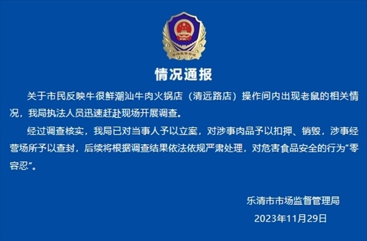 ·溫州樂清官方通報火鍋店現(xiàn)老鼠啃牛排:已對當事人予以立案,對涉事肉品予以扣押、銷毀,涉事經營場所予以查封。