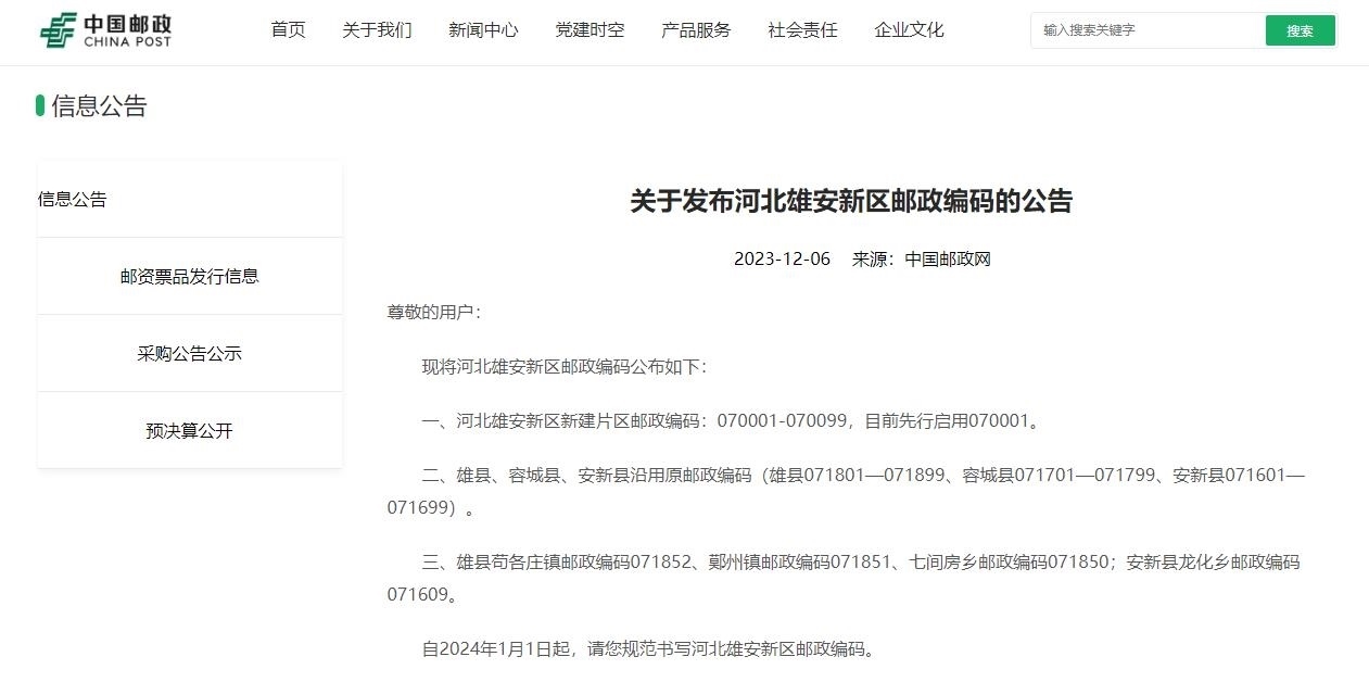 央視網(wǎng)消息:據(jù)中國郵政網(wǎng)消息,中國郵政集團有限公司今天發(fā)布河北雄安新區(qū)郵政編碼,以下為公告全文: