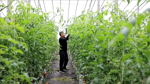 山東省壽光市稻田鎮(zhèn)崔嶺西村村民崔新中在棚內(nèi)查看蔬菜長(zhǎng)勢(shì)。(壽光市委宣傳部供圖)