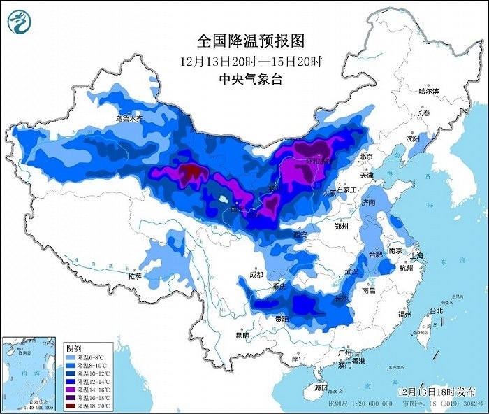 其中,12月13日20時至12月15日20時,新疆中東部、內(nèi)蒙古中西部、甘肅、寧夏、青海、陜西中北部、山西北部等地將出現(xiàn)8~12℃降溫,甘肅、內(nèi)蒙古河套地區(qū)、陜西北部局地降溫可達14℃以上。