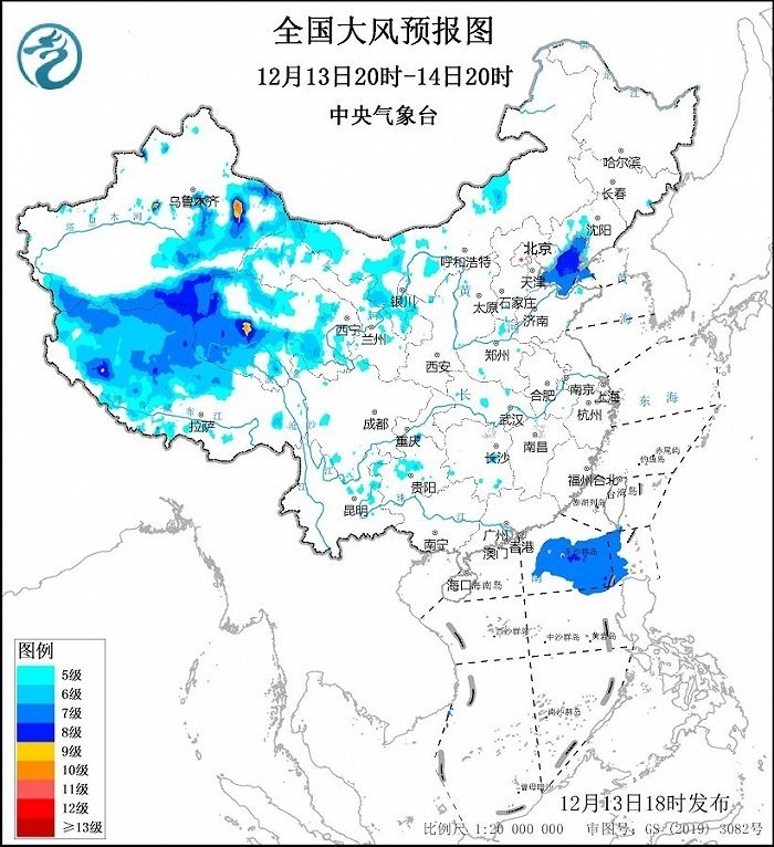 中央氣象臺12月13日18時發(fā)布大風藍色預警: