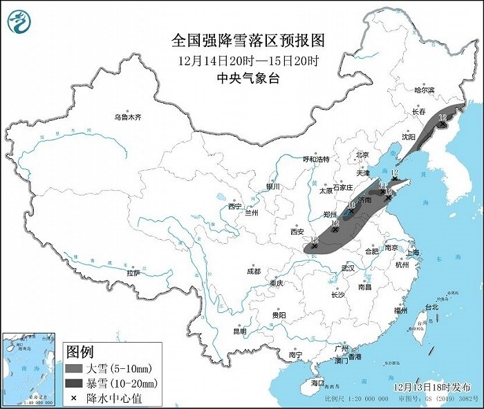 預計12月13日20時至12月14日20時,內(nèi)蒙古河套地區(qū)、陜西北部和中部以及秦嶺東部、山西南部、湖北西北部、河南中西部、河北中南部、北京西南部、山東北部和西部、遼寧東北部等地部分地區(qū)有大到暴雪,其中,河南西部和陜西秦嶺東部局地有大暴雪或特大暴雪(30~35毫米)。上述部分地區(qū)新增積雪深度5~10厘米,局地可達18厘米以上。