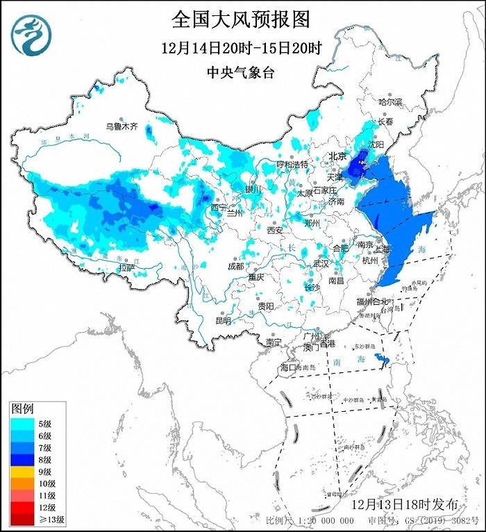 12月14日20時至15日20時,內(nèi)蒙古中西部、寧夏、西藏西部、青海東部和南部等地部分地區(qū)有5~6級、陣風7~9級的大風;渤海、渤海海峽、黃海大部海域、東海西部海域?qū)⒂?~8級、陣風9級的大風,其中渤海東北部的部分海域風力可達9級、陣風10級。