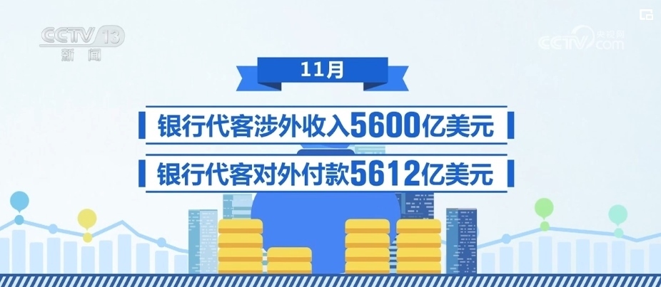 11月,銀行代客涉外收入5600億美元,對外付款5612億美元。1—11月,銀行代客累計涉外收入56233億美元,累計對外付款57060億美元。