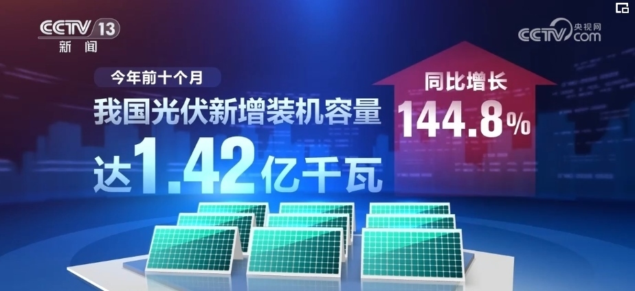 2023年前10個(gè)月,我國(guó)光伏新增裝機(jī)容量達(dá)1.42億千瓦,同比增長(zhǎng)144.8%。