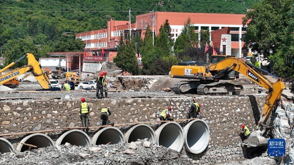 在北京市房山區(qū)霞云嶺中心小學(xué),北京建工機施集團的施工人員在搶建供學(xué)校與外界通行的新橋梁(2023年8月23日攝,無人機照片)。新華社記者 鞠煥宗 攝
