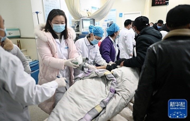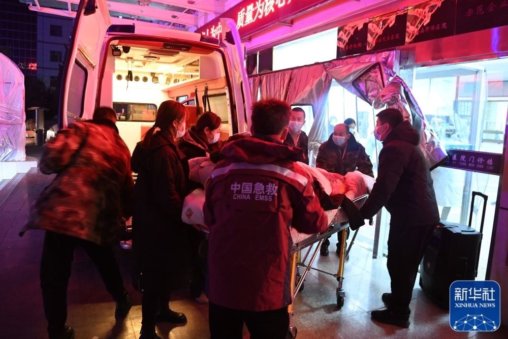 12月19日,地震傷員被送至甘肅省臨夏回族自治州積石山縣人民醫(yī)院。新華社記者 范培珅 攝