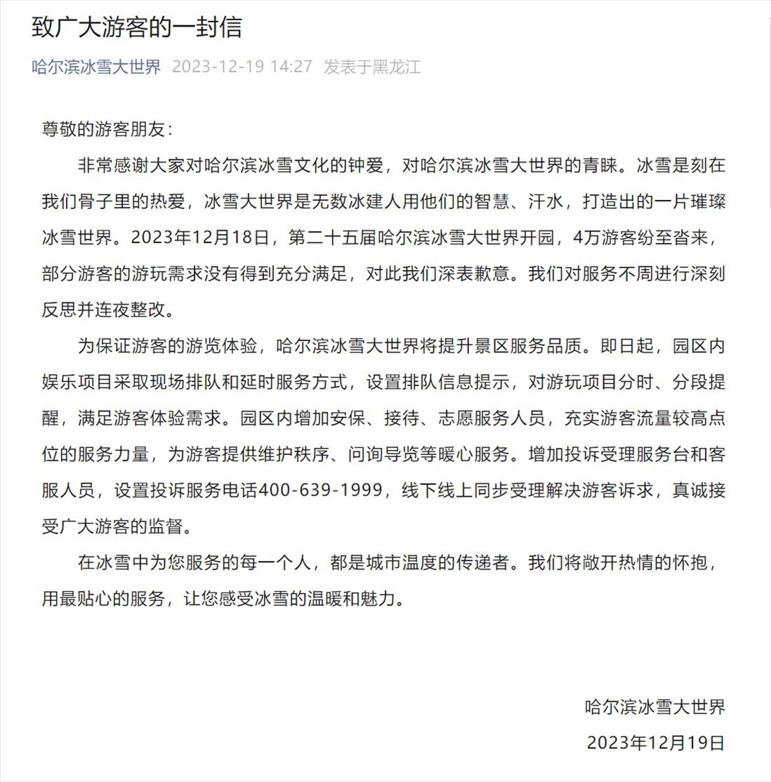 ·哈爾濱冰雪大世界開(kāi)園首日被喊退票,園區(qū)發(fā)文致歉:連夜整改。當(dāng)?shù)匚穆镁只貞?yīng)已去現(xiàn)場(chǎng)督導(dǎo)。