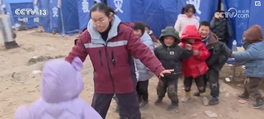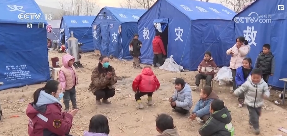 在康吊村三社的臨時安置點,來自甘肅省第二人民醫(yī)院的心理治療師李轉(zhuǎn)雄正帶著村里的孩子做游戲。丟手絹、老鷹抓小雞,在一遍又一遍的追逐當中,孩子們的笑聲越來越響亮。