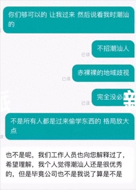 ·廣東深圳一男子求職因籍貫是潮汕直接被拒,工作人員稱(chēng)“老板說(shuō)潮汕人就會(huì)偷偷摸摸學(xué)東西”。