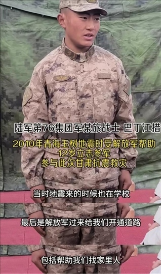 巴丁江措,第76集團(tuán)軍某旅戰(zhàn)士。2010年青海玉樹(shù)地震時(shí),解放軍幫他脫險(xiǎn)。如今,同樣成為解放軍的他奮戰(zhàn)在甘肅抗震救災(zāi)一線(xiàn)。他說(shuō):“我想對(duì)以前救我的人說(shuō),我?guī)椭烁嗳?,讓他們?yōu)槲因湴粒 ?/p>