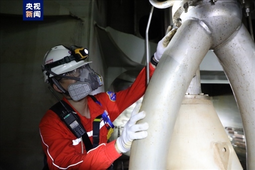 △“深海一號(hào)”現(xiàn)場(chǎng)作業(yè)人員正在對(duì)凝析油艙內(nèi)浸沒泵等設(shè)備狀態(tài)進(jìn)行檢查維保