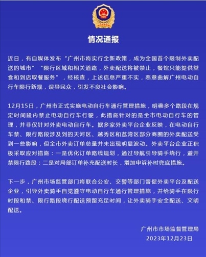 ·網(wǎng)傳廣州限制外賣配送?廣州市市場監(jiān)督管理局:嚴重不實。