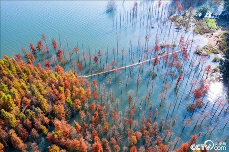 福建南平,延平區(qū)爐下鎮(zhèn)斜溪社區(qū)村洲頭島的落羽杉樹掩映閩江,色彩繽紛點綴冬日。