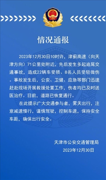 ·津薊高速發(fā)生多起追尾交通事故,警方通報(bào):致22輛車(chē)受損、8人輕微傷。