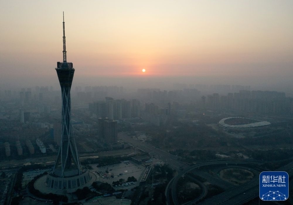 這是1月1日在河南省鄭州市中原福塔附近拍攝的日出(無人機(jī)照片)。新華社記者 李嘉南 攝