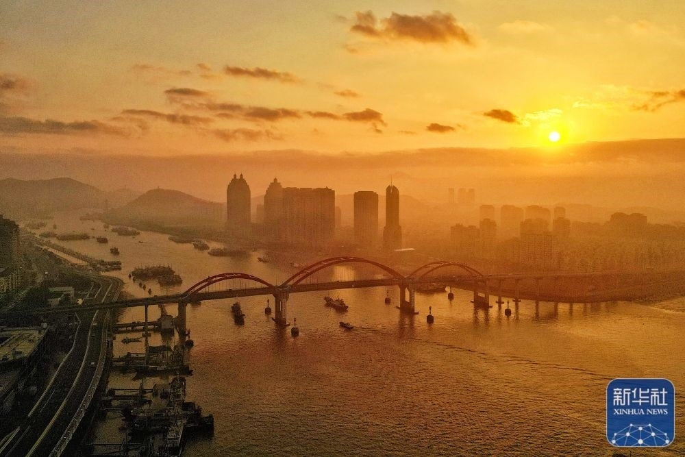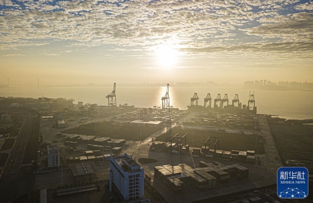 這是1月1日在海南自貿(mào)港重點園區(qū)——洋浦經(jīng)濟(jì)開發(fā)區(qū)拍攝的晨光(無人機(jī)照片)。新華社記者 蒲曉旭 攝